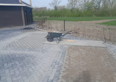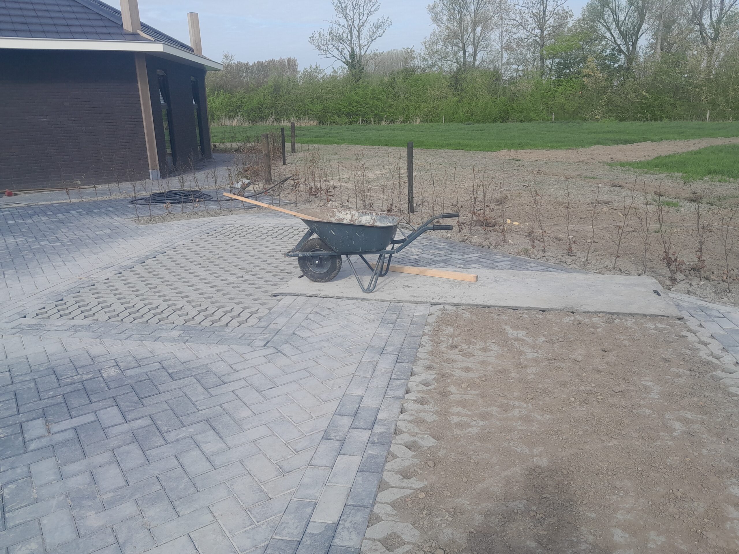 De parkeerplaats is ook zo goed als klaar. We zijn nu de doorgroeitegels in de parkeerplaatsen aan het inzaaien en het grasveld is ook gevlakt en ingezaaid. De beukenhaag en aangeplante rozen beginnen al uit te lopen. Al met al echt lente!